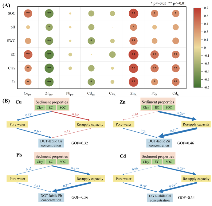 研究结果表明,中国海岸带微量金属存在显著空间分布特征:渤海和东海区域浓度较高,而南海和黄海区域较低。站点HLD(葫芦岛)和HZW(杭州湾)分别呈现出DGT有效态和总量金属的峰值。沉积物特性(EC、黏粒含量、SOC)是调控DGT有效态金属的主要因素,这些因素主要通过增强金属固-液再供给能力(竞争吸附、离子交换与SOC矿化)影响Cd、Pb、Zn的生物有效性,通过提高其在孔隙水中的溶解度(有机络合与氯络合物形成)调控Cu的生物有效性。