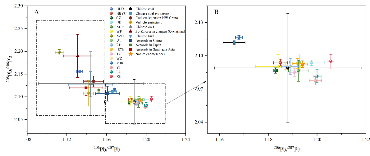 图2 沉积物中Pb同位素比值及其表征的潜在来源