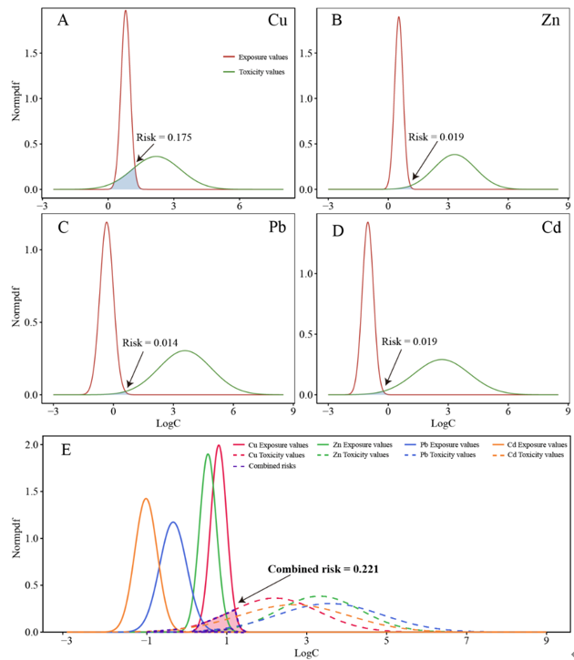 微量金属单一金属风险商(RQ)依次为:Cu(2.66)> Pb(0.47)> Cd(0.26)> Zn(0.04)(>1表明可能造成生态威胁)。所有站点沉积物中Cu均超过风险阈值。毒性概率分别为:Cu=17.5%、Zn=1.9%、Cd=1.9%、Pb=1.4%。微量金属的复合污染对水生生物产生毒性效应的概率为22.1%。